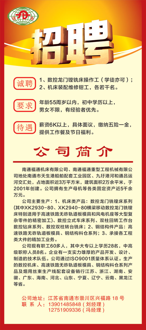 誠聘(2026):數(shù)控龍門鏜銑床操作工,機床裝配維修鉗工若干名